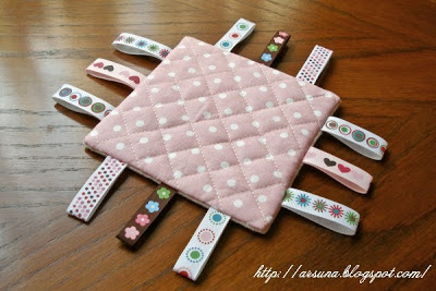 Вторая игрушка в виде прихватки. У нее две стороны, мягкая из флиса и фактурная, из простеганного хлопка. И конечно ленточки, разные, красивые и много.